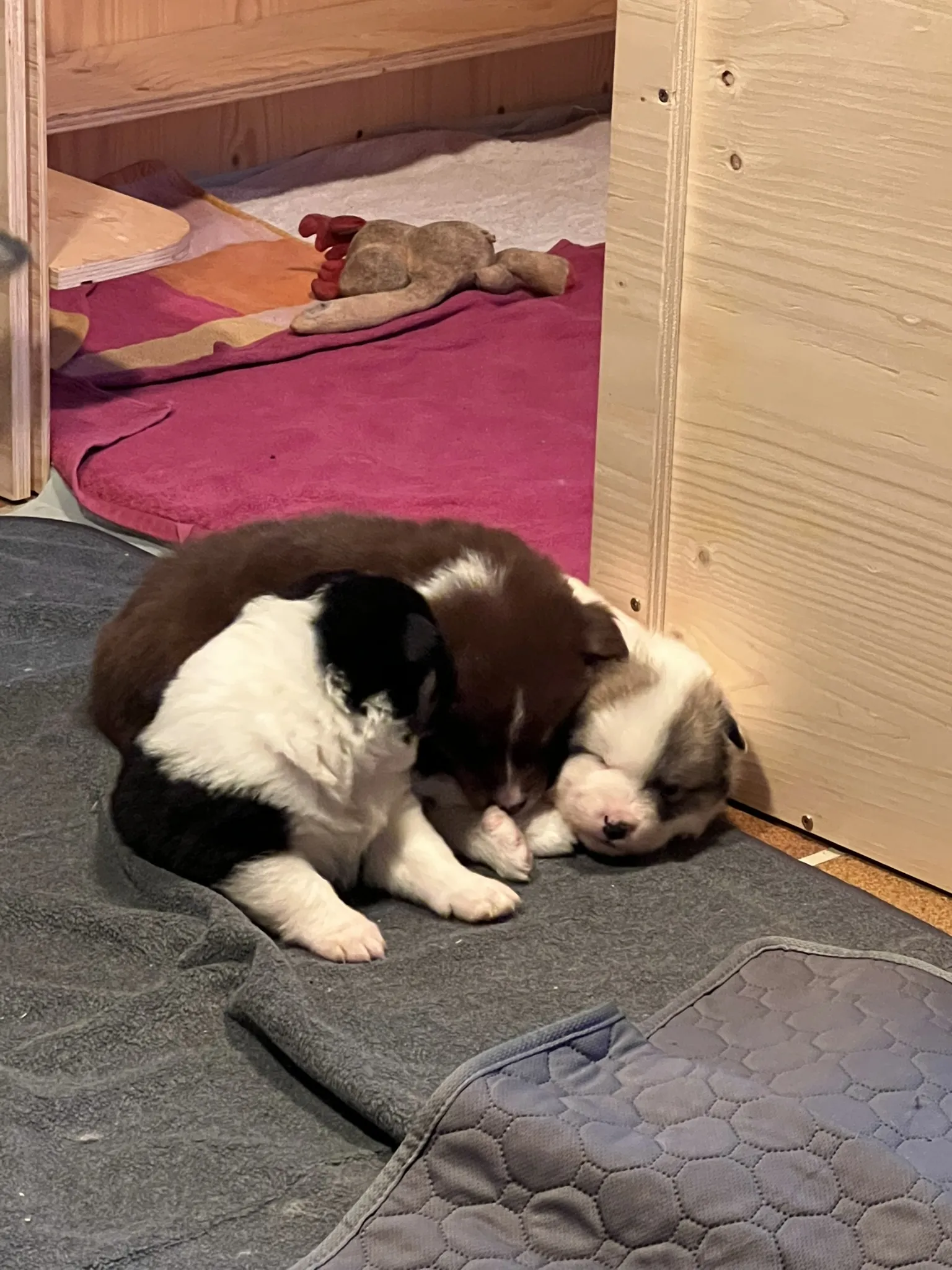 Auch untereinander wird immer mehr gespielt, geknurrt und gerangelt. Die Kleinen üben schon fleißig Hundesprache. Zwischendurch wird natürlich noch viel geschlafen und gekuschelt, am liebsten dicht aneinander oder bei Mama.